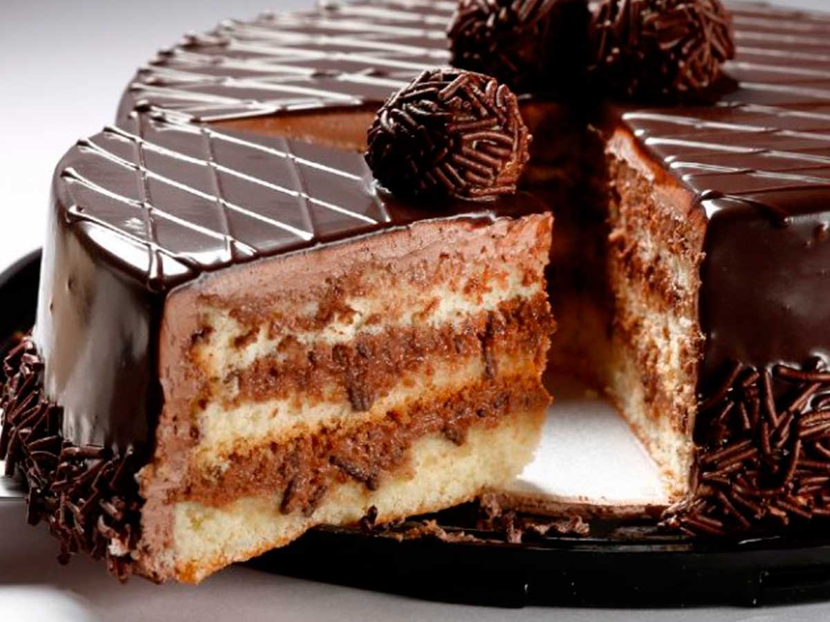 deliciosa torta con un biscocho de cacao 100% humedecida con tres leches y cubierta con chocolate